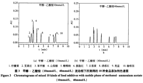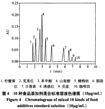 在提升的試驗標(biāo)準(zhǔn)下,10種食用添加劑在10min可以達(dá)到迅速剝離的必須 ,且分離度與敏感度都不錯。標(biāo)準(zhǔn)色譜圖見圖4。