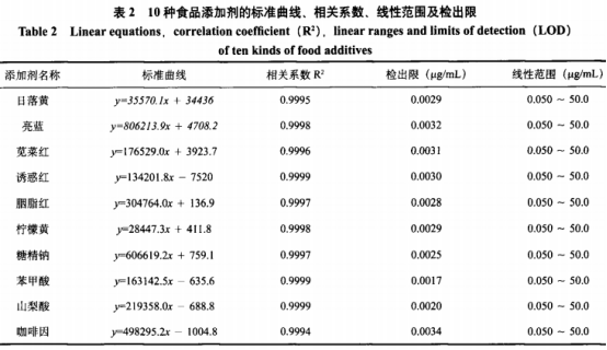 按提升好的實驗標(biāo)準(zhǔn)對10種食用添加劑混和標(biāo)液系列產(chǎn)品開展色譜,以各成分的峰總面積為縱軸,濃度值為橫坐標(biāo)軸,并制作標(biāo)曲。結(jié)果顯示,在0.050~50.0μg/mL范疇內(nèi),10種食用添加劑的濃度值與峰總面積呈優(yōu)良的線性相關(guān),相關(guān)系數(shù)rR2均超過0.999,以3倍頻率穩(wěn)定度(3S/N)測算方法檢出限,方法檢出限處于0.0017~0.0034μg/mL中間。標(biāo)曲、相關(guān)系數(shù)r、方法檢出限及線形范疇見表2。