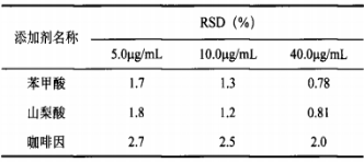 本實驗各自對5.0μg/mL、10.0μg/mL和40.0μg/mL三組濃度值的混和標(biāo)液開展7次平行測定。如表3所顯示,測量低、中、高三組濃度值的相對性相對標(biāo)準(zhǔn)偏差(RSD)范疇在0.69%~2.8%中間,說明本實驗精度優(yōu)良。