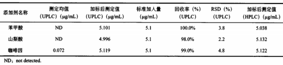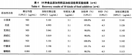 在試樣上開展5.1μg/mL加標(biāo)回收率實驗,每一組開展6次平行測定,并與傳統(tǒng)式液相色譜儀法開展對比剖析,如表4所顯示,UPLC檢驗的各成分試品利用率在97.9%~101.1%中間,全部總體目標(biāo)物的相對性相對標(biāo)準(zhǔn)偏差均低于5.0%,且二種方式所取得的效果有優(yōu)良的一致性。