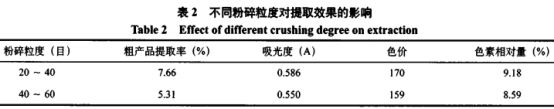 (2)選用挑選的較佳獲取有機(jī)溶劑,根據(jù)單要素 實(shí)驗(yàn),科學(xué)研究了干紅辣椒粉末狀的破碎粒度分布對(duì)干紅葡萄酒辣 椒中辣椒紅色素獲取實(shí)際效果的危害。數(shù)據(jù)顯示,以 20~40目粒度分布的干紅辣椒粉末狀獲取實(shí)際效果最好;