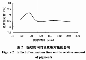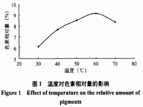 由圖1得知,獲取溫度在30~60℃范疇 內(nèi),黑色素相對(duì)性量隨環(huán)境溫度的上升而提升,當(dāng)環(huán)境溫度達(dá) 到60℃時(shí),黑色素相對(duì)性量做到最高值,隨溫度繼 續(xù)升高,黑色素相對(duì)性量反倒降低,且下降趨勢(shì)明 顯。關(guān)鍵是由于獲取全過程中氣溫上升,促使分子結(jié)構(gòu) 機(jī)械能提升,分子結(jié)構(gòu)中間的撞擊強(qiáng)烈,合理的撞擊機(jī) 會(huì)提升,因而總混的黑色素愈來愈多。當(dāng)溫度超 過60℃,機(jī)械能大幅度提升,別的化學(xué)物質(zhì)分子結(jié)構(gòu)中間的有 效碰撞也提升,一樣也被融解在萃取液中,進(jìn)而 造成 萃取液中沾有較多的殘?jiān)?,黑色素合理濃度值較 低,OD值值降低,即黑色素相對(duì)性量減少??紤]到 到高溫能耗大,因而,獲取溫度應(yīng)挑選為60℃。