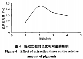 由圖4得知,當(dāng)獲取2次時(shí),黑色素相對(duì)性量達(dá) 到最高值,表明辣椒紅色素已基本上獲取徹底。隨 后,獲取頻次再次提升,黑色素相對(duì)性量反倒減少, 即不良反應(yīng)提升。因而,挑選獲取頻次為2次。