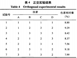 依據(jù)上述正交試驗(yàn)所確認(rèn)的最佳獲取加工工藝組 合,開展3次反復(fù)獲取試驗(yàn),數(shù)據(jù)顯示,黑色素相 對(duì)量為9.21%,相對(duì)性相對(duì)標(biāo)準(zhǔn)偏差RSD=0.31%,進(jìn)而 認(rèn)證了試驗(yàn)效果的穩(wěn)定性。