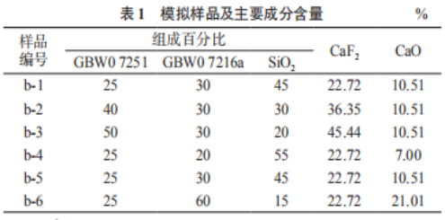 用瑩石國(guó)家標(biāo)準(zhǔn)物質(zhì)和石灰石國(guó)家標(biāo)準(zhǔn)物質(zhì)按一定占比配置6組高成分碳酸氫鈣基材含氟化鈣的仿真模擬試品,輔材為光譜儀純的SiO2,粒度分布均在75μm(200目)下列,氟化鈣成分操縱在10%~60%中間,序號(hào)分別為b–1,b–2,b–3,b–4,b–5,b–6,見(jiàn)表1。