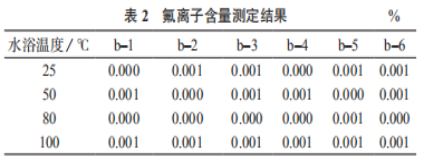 稱量仿真模擬試品0.3000g于50mL比色管中,添加10mLHCl水溶液(1 9),每一個(gè)比色管上添一套放有氫氧化鈉溶液的廢氣搜集設(shè)備用以搜集稀硫酸溶樣時(shí)造成的汽體,各自在25,50,80℃開(kāi)水浴中加溫30min,調(diào)整回收器中溶劑的酸值,用氟離子可選擇性電級(jí)開(kāi)展測(cè)量,結(jié)果列于表2。由表2得知,不一樣水浴溫度下氟離子基本上沒(méi)有損害。