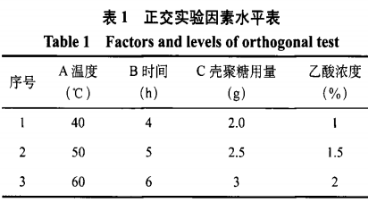 按之上流程開展單要素試驗(yàn),調(diào)查反映溫度、時間、殼聚糖使用量、甲酸濃度值等要素對商品糖汁褪色作用的危害,并進(jìn)一步選用正交設(shè)計提升該復(fù)合型回應(yīng)劑的配制加工工藝標(biāo)準(zhǔn)。