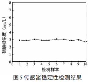 感應(yīng)器應(yīng)用性關(guān)鍵包含可靠性、可重復(fù)性、和敏感度。實(shí)際的檢測(cè)方法如下所示上述:穩(wěn)定性測(cè)試:隨便選擇一份山東濰坊市軍埠口鎮(zhèn)的一份水質(zhì)采樣,并將按容積均分成10等份,各自裝在10個(gè)試管嬰兒中,運(yùn)用文中制定的感應(yīng)器各自對(duì)這10個(gè)試驗(yàn)中的水質(zhì)樣版開(kāi)展檢驗(yàn),對(duì)測(cè)量的信息做好紀(jì)錄,并測(cè)算差異指數(shù)(CV值),試驗(yàn)結(jié)果如下圖5所顯示:
