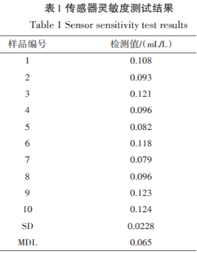 MDL=3.143δ,(δ為對(duì)同一樣版反復(fù)檢驗(yàn)10次獲得的標(biāo)準(zhǔn)偏差),最終獲得文中制定的感應(yīng)器的最少檢驗(yàn)幅值為0.065mL/L。這說(shuō)明文中制定的感應(yīng)器擁有優(yōu)良的敏感度。實(shí)際的研究結(jié)果以下表1所顯示: