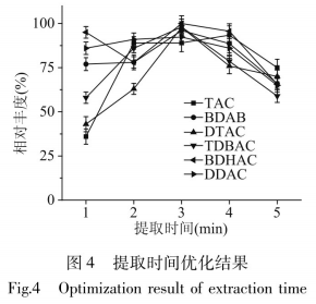 獲取時問就是指獲取劑和試品觸碰后從超聲波丌始到完成的時間,獲取時問過短,獲取小夠充足;獲取時問太長會帶到太多影響化學(xué)物質(zhì)與此同時工業(yè)甲醇很有可能蒸發(fā)較多,減少獲取高效率,消耗的時長和動能太多。本科學(xué)研究調(diào)查了獲取時問為1、2、3、4和5min時的獲取實(shí)際效果,結(jié)果如圖所示4所顯示,試驗(yàn)發(fā)覺當(dāng)獲取時問為3min時作用最好。總的來說,選擇3min為最好獲取時間。