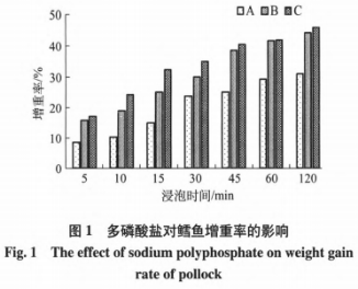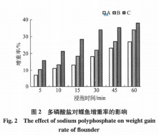 對銀鱈魚來講,較低濃度的的多聚磷酸鹽泡浸計劃方案A,泡浸時間120min,體重增加做到31.1%,多聚磷酸鹽含量為5.016g/kg;中濃度值的多聚磷酸鹽泡浸計劃方案B,泡浸時間30min,體重增加做到30%,多聚磷酸鹽含量為5.111g/kg;濃度較高的的多聚磷酸鹽泡浸計劃方案C,泡浸時間10min,體重增加做到24%,多聚磷酸鹽含量為5.230g/kg。對鰈魚來講,較低濃度的的多聚磷酸鹽泡浸計劃方案A,泡浸時間60min,體重增加做到26.8%,多聚磷酸鹽含量為5.110g/kg;中濃度值的多聚磷酸鹽泡浸計劃方案B,泡浸時間30min,體重增加做到22%,多聚磷酸鹽含量為5.014g/kg;濃度較高的的多聚磷酸鹽泡浸計劃方案C,體重增加做到21.3%時,多聚磷酸鹽含量為4.991g/kg,泡浸時間10min。
