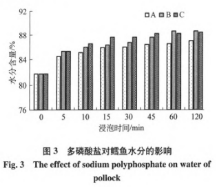 針對(duì)銀鱈魚來講,應(yīng)用較低濃度的泡浸計(jì)劃方案A,泡浸120min,水份占比為87%,銀鱈魚中聚磷酸鹽含量為5.016g/kg;應(yīng)用中濃度值的泡浸計(jì)劃方案B,泡浸30min時(shí),水份占比為86.7%,銀鱈魚中聚磷酸鹽含量為5.mg/kg;應(yīng)用濃度較高的的泡浸計(jì)劃方案C;泡浸10min時(shí),水份占比為86.5%,銀鱈魚中聚磷酸鹽含量為5.230g/kg。