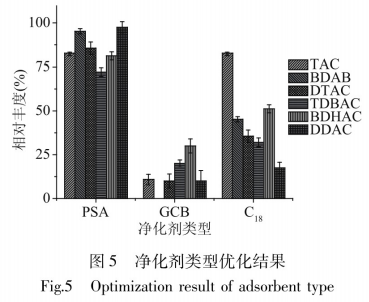 本分析選擇的獲取方法是超聲波輔助提純,超音波發(fā)生的輻射源氣體壓強(qiáng)、空化效應(yīng)及振動(dòng)分析等在試品和獲取劑之問造成了聲波頻率空蝕功效。,提升了觸碰而積,加速對流傳熱速率。食品包裝材料拿紙中包含各種各樣食品添加劑和印刷油墨,超聲波獲取抗壓強(qiáng)度比較大,如果不應(yīng)用凈化劑凈化處理,則難以避免地導(dǎo)致很強(qiáng)的栽培基質(zhì)抑制效應(yīng),進(jìn)而危害檢查結(jié)果。本分析參照農(nóng)殘檢測中精選的QuEChERS方式,科學(xué)研究了GCB、PSA、C18三種凈化劑的清潔實(shí)際效果,試驗(yàn)發(fā)覺GCCB和C18對季銨鹽抗菌劑均有不一樣水平的吸咐,在其中CCB基本上吸咐了全部的BDAB,而應(yīng)用PSA時(shí),試驗(yàn)得到了不錯(cuò)的獲取實(shí)際效果,故試驗(yàn)最后選擇PSA做為凈化劑,其效果如圖所示5所顯示。