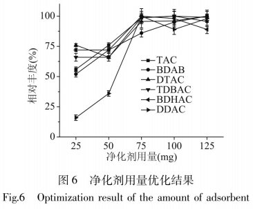 吸收劑使用量的幾個(gè)關(guān)聯(lián)著影響成分的危害是不是獲得最高程度上的減少,本科學(xué)研究進(jìn)一步調(diào)查了PSA使用量為25、50、75、100、125mg時(shí)的獲取實(shí)際效果,結(jié)果如圖所示6所顯示。試驗(yàn)發(fā)覺75mg時(shí)6種抗菌劑季銨鹽均獲得較好的實(shí)際效果,伴隨著使用量再次提升,獲取實(shí)際效果沒有顯著轉(zhuǎn)變,故選擇75mgPSA為本辦法的最后提升標(biāo)準(zhǔn)。