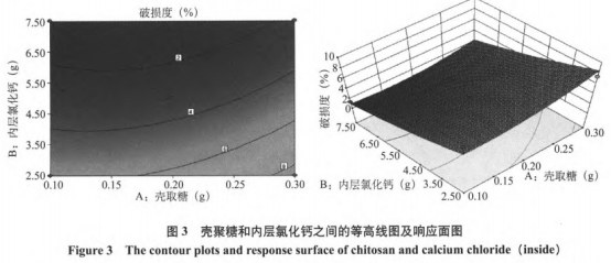 由響應(yīng)面的研究結(jié)果得到,殼聚糖使用量0.139,里層氯化鈣使用量6.879,海藻酸鈉的使用量3.819,表層氯化鈣使用量3.469時,在這里最好情況下,燕麥片顆粒物的損壞度最少,損壞數(shù)為0.44%。