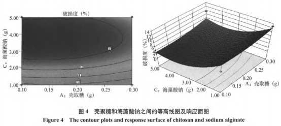 從圖4得知,回應(yīng)斜面的張口往上,表明殼聚糖和海藻酸鈉中間的配制配對t檢驗較差,固定不動海藻酸鈉的使用量,殼聚糖的劑量提升對燕麥片顆粒物損壞度基本上無危害;固定不動殼聚糖的使用量,海藻酸鈉的劑量對燕麥片顆粒物損壞度的干擾展現(xiàn)慢慢增加的發(fā)展趨勢。等高線圖中,沿A軸方位的線密度較低,C軸方位的線密度相對性較高,表明海藻酸鈉使用量的危害比殼聚糖的危害更高。