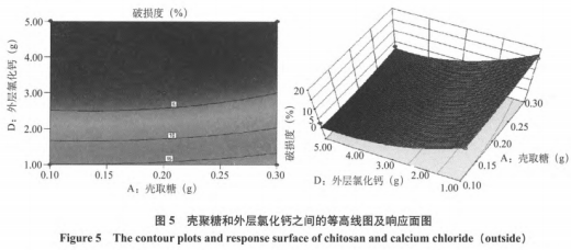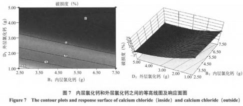 從圖5得知,回應(yīng)斜面的張口往上,表明殼聚糖和表層氯化鈣之問的配制配對t檢驗較差,固定不動表層氯化鈣的使用量,殼聚糖的劑量提升對燕麥片顆粒物損壞度基本上無危害;固定不動殼聚糖的使用量,表層氯化鈣的劑量對燕麥片顆粒物損壞度的干擾展現(xiàn)慢慢增加的發(fā)展趨勢。等高線圖中,沿A軸方位的線密度較低,D軸方位的線密度相對性較高,表明表層氯化鈣使用量的危害比殼聚糖的危害更高。