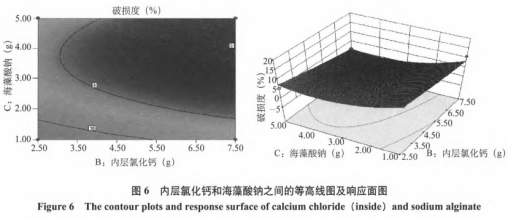 從圖6得知,回應(yīng)斜面的張口往上,表明里層氯化鈣和海藻酸鈉中間的配制配對t檢驗較差,固定不動里層氯化鈣的使用量,伴隨著海藻酸鈉使用量的提升,燕麥片顆粒物損壞度展現(xiàn)減少的發(fā)展趨勢;固定不動海藻酸鈉的使用量,伴隨著里層氯化鈣使用量的提升,燕麥片顆粒物損壞度也展現(xiàn)逐步減少的發(fā)展趨勢。等高線圖中,沿B軸方位的線密度較高,C軸方位的線密度相對性較低,表明里層氯化鈣使用量的危害比殼聚糖的危害更高。