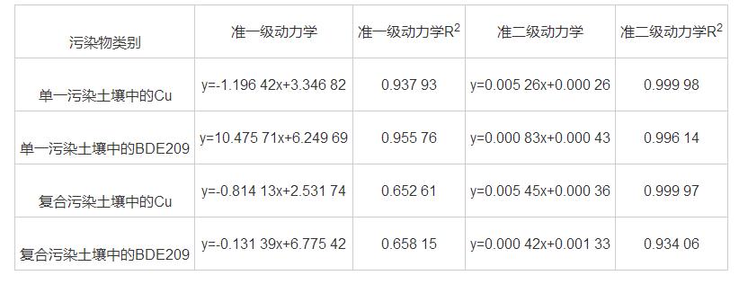 對Cu單一環(huán)境污染土壤層、BDE209單一環(huán)境污染土壤層及其Cu-BDE209復(fù)合型環(huán)境污染土壤層的動(dòng)力學(xué)方程線性擬合結(jié)果見表1。結(jié)果顯示,準(zhǔn)一級動(dòng)力學(xué)方程線性擬合的R2均稍低,評測均衡過柱量與基礎(chǔ)理論均衡過柱量差距很大,因而準(zhǔn)一級動(dòng)力學(xué)方程不可以有效地形容這3種環(huán)境污染土壤層的過柱全過程。準(zhǔn)二級動(dòng)力學(xué)方程線性擬合的R2均超過0.9,評測均衡過柱量與基礎(chǔ)理論均衡過柱量相距不大,因而過柱全過程合乎準(zhǔn)二級動(dòng)力學(xué)方程,表明Cu單一、BDE209單一和Cu-BDE209復(fù)合型環(huán)境污染土壤層的過柱全過程均是根據(jù)化學(xué)變化的力學(xué)全過程。