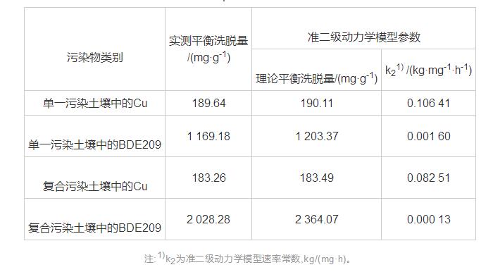 LED3A對單一環(huán)境污染土壤環(huán)境中的Cu和單一環(huán)境污染土壤環(huán)境中的BDE209的過柱均衡時(shí)間各自是在6、12 h上下,最大過柱率各自為76.10%和25.35%;LED3A對復(fù)合型環(huán)境污染土壤環(huán)境中Cu和BDE209的最大過柱率各自為73.20%和40.57%。LED3A對復(fù)合型環(huán)境污染土壤環(huán)境中BDE209的過柱實(shí)際效果更好于單一環(huán)境污染土壤環(huán)境中的BDE209,可能是因?yàn)閺?fù)合型環(huán)境污染土壤環(huán)境中Cu的推動(dòng)作用。準(zhǔn)二級動(dòng)力學(xué)方程可精確敘述LED3A對Cu單一環(huán)境污染土壤層、BDE209單一環(huán)境污染土壤層及其Cu-BDE209復(fù)合型環(huán)境污染土壤層的過柱全過程,表明過柱全過程均是化學(xué)變化。