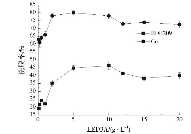 伴隨著LED3A濃度值的擴(kuò)大,復(fù)合型環(huán)境污染土壤環(huán)境中Cu和BDE209的過柱首先上升后減少,最好過柱濃度值為5 g/L。pH對BDE209的過柱率危害比較大;pH對Cu的過柱率危害較小,最好pH為8。土水比的擴(kuò)大有益于Cu和BDE209過柱率的擴(kuò)大,最好土水之比40 mL/g。