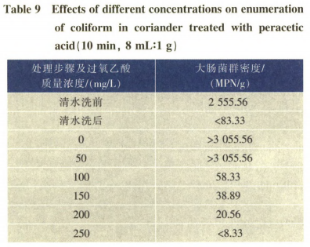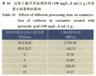 10min(水菜容積質(zhì)量比),80mg/1、8m1:1g解決10min(解決濃度值),150mg/1、8m1:1g解決10min(解決濃度值):較大減菌總數(shù)各自為2.291g(CFU/g)、2.791g(CFU/g)、0.991g(CFU/g)。二氧化氯減菌實(shí)際效果最強(qiáng),氫氧化鈣其次,次氯酸鈉溶液較弱且減菌實(shí)際效果差。3種減菌劑解決對(duì)香菜大腸桿菌的調(diào)節(jié)作用與菌落總數(shù)類似,減菌實(shí)際效果從強(qiáng)至弱先后為:二氧化氯、氫氧化鈣、次氯酸鈉溶液。