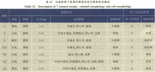 從現(xiàn)切香菜中分離出來出7種不一樣的菌種,各自編碼為1、2、3、C11、Y4、C1、12。分離出來得到的7種菌種的菌體形狀敘述、菌體形狀見表13和圖10。依據(jù)分離出來得到的7種菌種的菌體形狀敘述表及菌體形狀圖得知:菌種所有為革蘭氏陽性菌陰性菌。關(guān)鍵為乳白色或是淡黃色。均正圓形。7株菌表層特點(diǎn)顯著,除Y4菌種外,其他菌體核心不透,且外表光潔潮濕。根據(jù)鏡檢查發(fā)覺,Y4菌種菌體特點(diǎn)為球形,別的菌種菌體呈桿狀或短桿狀。