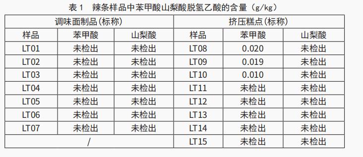 表1中LT01~LT07是包裝設(shè)計(jì)標(biāo)注稱之為“調(diào)料食品”的辣皮,LT08~LT15是標(biāo)稱之為“壓擠點(diǎn)心”的辣皮。GB2760-2014《食品安全國(guó)家標(biāo)準(zhǔn)食品添加劑使用標(biāo)準(zhǔn)》(下稱GB2760)對(duì)調(diào)料食品中苯甲醛的限定要求是不可加上,對(duì)調(diào)料食品中山梨酸的限定要求是不可加上。若辣皮食品類按目前要求以“調(diào)料食品”開展管理方法,則LT08、LT09、LT10試品歸屬于超出范圍加上食用添加劑的不過(guò)關(guān)食品類。