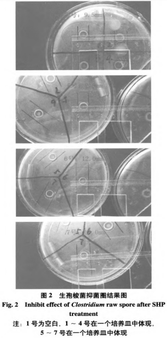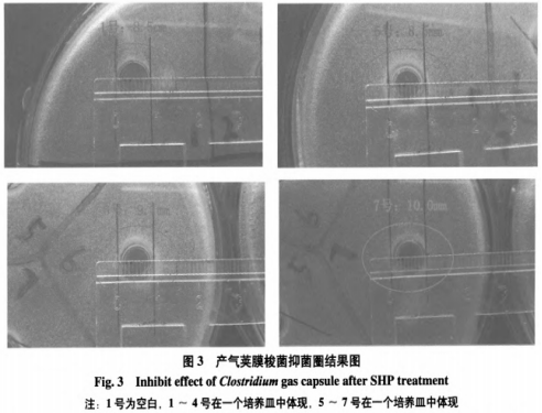 圖3中,2號到花了7天時間都是有抑菌圈,抑菌圈的直徑基本上相同都是8.5mm,六號抑菌圈擴張為9.1mm,花了7天時間抑菌圈變成10.0mm。2號至5號發(fā)生了抑菌圈,可能是因為脹氣莢膜梭菌吸濕裂化,盡管脹氣莢膜梭菌并不是嚴謹?shù)木G膿桿菌,但也有可能由于純凈水中包含大量的的co2促使生孢梭菌身亡;六號和花了7天時間抑菌圈顯著增大,表明SHP對脹氣莢膜梭菌有顯著抗菌實際效果,且SHP對脹氣莢膜梭菌的抗菌實際效果也隨濃度值的提高而提高。