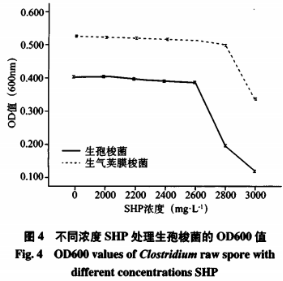 脹氣莢膜梭菌被0~2800mg/L的SHP水溶液解決時,OD值基本上不會改變,而OD值在SHP濃度值3000mg/L處逐漸驟降,表明在偏酸性自然環(huán)境下,36℃塑造24hSHP對脹氣莢膜梭菌的最少抗菌濃度值(MIC)為2800mg/L。根據(jù)試驗結(jié)論還可以看得出,脹氣莢膜梭菌的最少抗菌濃度值比生孢梭菌的大,SHP對身孢梭菌的抗菌效果非常的好于脹氣莢膜梭菌,這一結(jié)果與抑菌圈試驗的理論依據(jù)是一致的。