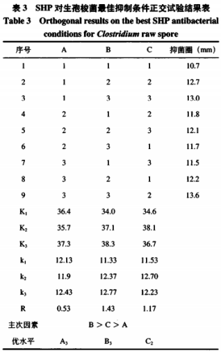 表3中,6號、2號、3號、9號是九組中抑菌圈里非常大的四組,從大到小排列為:9>3>2>8。表3中,能夠得到A3B3C2為較佳組成,得到最好抗菌標準為:溫度40℃,塑造時間為20h,pH為6.0(偏酸堿性);次序要素的排列為:B(時間)>C(塑造時間)>A(pH)。經(jīng)對各要素明顯分辨方差分析結(jié)果顯示,溫度、塑造時間,這三個要素對SHP對身孢梭菌生長發(fā)育的抑止危害不明顯,表明在SHP抑止生孢梭菌生長發(fā)育歷程中,生孢梭菌具備不錯的耐熱性,且具備很大的pH功效范疇。