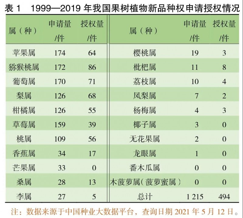 現(xiàn)階段,在我國已公布了11批農(nóng)牧業(yè)綠色植物種類維護(hù)名冊,受保障的農(nóng)牧業(yè)綠化植物已達(dá)191個綠色植物屬(種),在其中桃樹有21個屬(種)。截止到2019年底,共審理農(nóng)牧業(yè)種類權(quán)申請辦理33 803件,共受權(quán)13959件。在我國桃樹有19個屬(種),共申請辦理植物新品種權(quán)1215件,占農(nóng)牧業(yè)種類權(quán)總申請量的3.59%,申請辦理總數(shù)在100件上面的有蘋果屬(174件)、奇異果屬(172件)、紅提屬(170件)、草莓苗屬(159件)、梨屬(126件)、柑橘屬(126件)、桃屬(109件);別的桃樹屬(種)申請量均在100件下列,牛奶果屬、木菠蘿屬(菠蘿屬)2個屬暫沒有申請辦理。在其中,有15個桃樹屬(種)共得到受權(quán)494件,占農(nóng)牧業(yè)種類權(quán)總授權(quán)量的3.54%,占桃樹總申請量的40.66%;受權(quán)總數(shù)在50件上面的有奇異果屬(86件)、紅提屬(71件)、梨屬(68件)、蘋果屬(64件)、桃屬(56件)、柑橘屬(55件);青芒果屬、椰子鞋屬、番石榴屬、桂圓屬4個屬有申請辦理,但目前為止沒有種類得到受權(quán)(表1)。