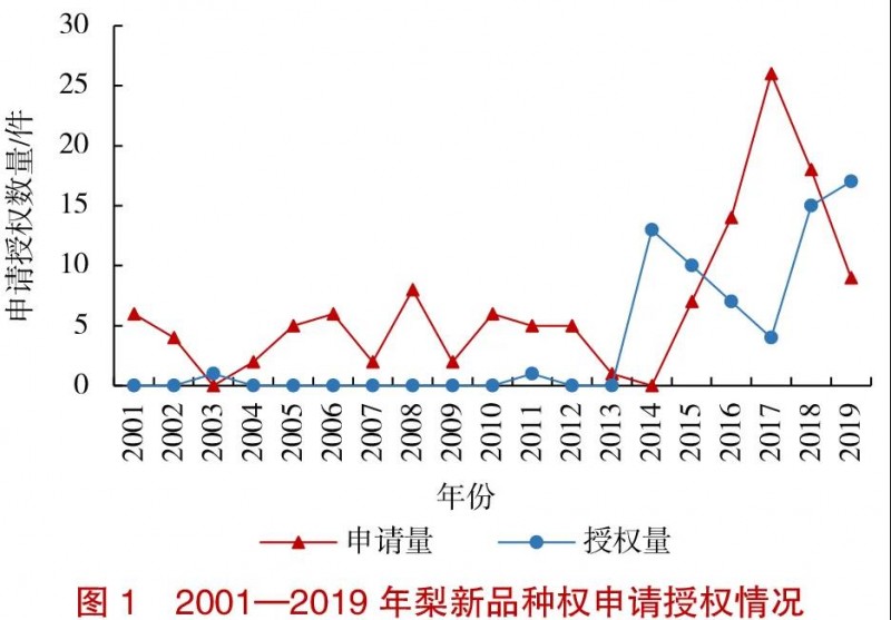 1997年,在我國頒布實施了《中華人民共和國植物新品種保護(hù)條例》,將植物新品種維護(hù)列入專利權(quán)維護(hù)。1999年添加國際性植物新品種維護(hù)同盟(UPOV),并審理植物新品種維護(hù)的申請辦理。植物新品種維護(hù)規(guī)章制度做為農(nóng)牧業(yè)行業(yè)一項關(guān)鍵的IP保障規(guī)章制度,已變成促進(jìn)農(nóng)牧業(yè)繁育自主創(chuàng)新、推動農(nóng)村經(jīng)濟(jì)快速發(fā)展的主要確保。掌握和科學(xué)研究梨優(yōu)良品種維護(hù)現(xiàn)況,提升梨優(yōu)良品種維護(hù)對推動在我國梨產(chǎn)業(yè)鏈可持續(xù)發(fā)展觀、提高梨牧業(yè)競爭能力有著關(guān)鍵實際意義。文中以中國種業(yè)數(shù)據(jù)管理平臺(http://202.127.42.145)數(shù)據(jù)信息為基本,對2001—2019年在我國梨優(yōu)良品種權(quán)維護(hù)申請辦理和受權(quán)狀況完成數(shù)據(jù)分析,找到存在的問題并提意見,以求為在我國梨品種權(quán)維護(hù)給予有利參照。