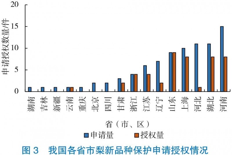 梨是中國遍布最普遍的桃樹綠化植物,除港澳以外,在我國32個省(自治州、市轄區(qū))均有杏樹種植?,F(xiàn)階段國內(nèi)一共有16個?。ㄗ灾沃?、市轄區(qū))申請辦理了梨優(yōu)良品種權(quán),10個?。ㄗ灾沃荨⑹休爡^(qū))得到了梨優(yōu)良品種權(quán)。河南申請量絕大部分,授權(quán)量排第2,各自為15件和8件;湖北和河北申請量均居第2位,均為11件,授權(quán)量各自為8件和1件;上海申請量和授權(quán)量各自為10件和8件;山東申請量和授權(quán)量均為9件(圖3),授權(quán)量絕大部分。