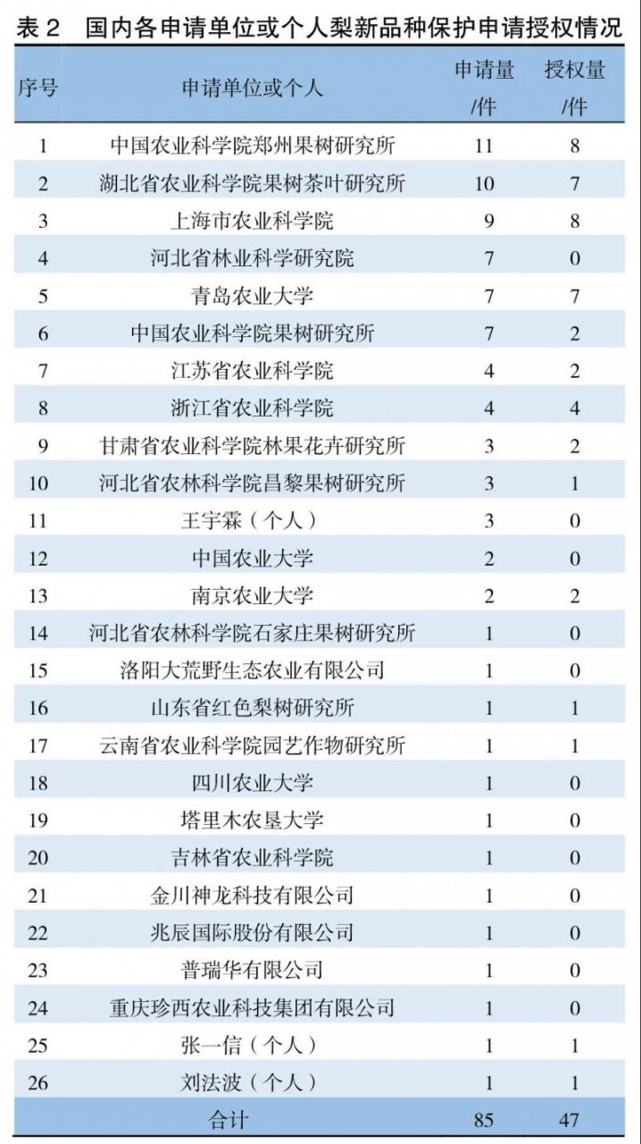 中國26個科學(xué)研究培訓(xùn)企業(yè)、公司和本人共申請辦理梨品種權(quán)85件,受權(quán)47件,在其中中國科學(xué)研究培訓(xùn)企業(yè)有18個,申請辦理梨品種權(quán)75件,受權(quán)45件;中國公司5個,申請辦理梨品種權(quán)5件,尚未受權(quán);中國本人3個,共申請辦理梨品種權(quán)5件,受權(quán)2件。中國農(nóng)業(yè)科學(xué)院鄭州市桃樹研究室申請量和授權(quán)量均絕大部分,各自為11件和8件(表2)。