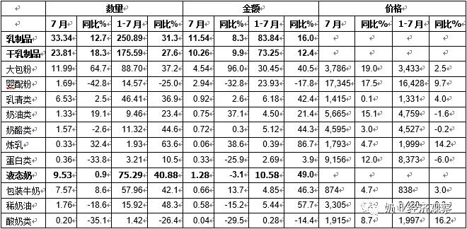 2.2.1  干奶制品1-7月出入口8894.27噸 同比增速20.1%