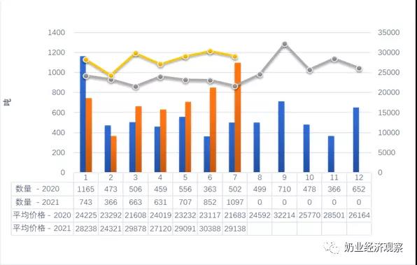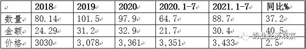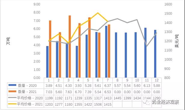 2021年1-7月,在我國進口紫花苜蓿麥草總計79.1八萬噸,同期相比 7.6%,進口額度2.89億美金,同期相比 7.8%,均值到岸價363.79美元/噸,同期相比 0.2%。