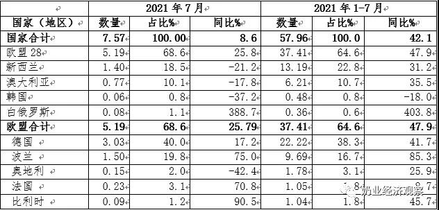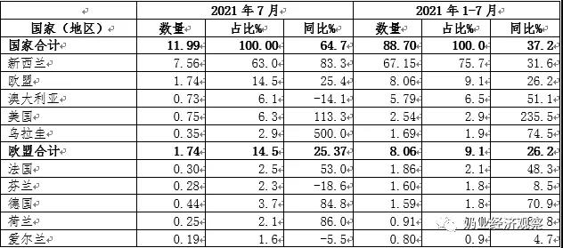 在其中,從歐盟國家進口5.19萬噸級,占68.6%,同比增速25.8%,從澳大利亞進口1.4萬噸,占18.5%,同比減少21.2%,從澳洲進口0.7七萬噸,占10.1%,同比減少17.8%。
