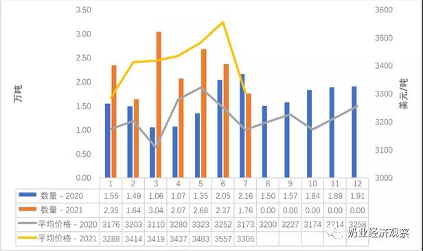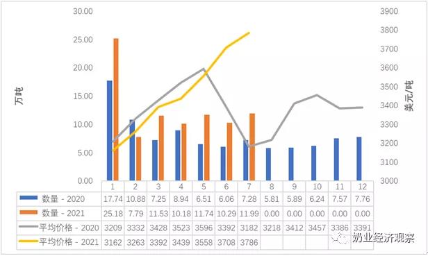 7月從澳大利亞、蘇丹、巴西等小量進口。澳大利亞0.49萬噸級,占有率3.1%,同期相比 329.2%;均值到岸價338.8一美元/噸,同期相比-3.3%。蘇丹0.十五萬噸,占有率1.0%,同期相比 33.9%;均值到岸價359.77美元/噸,同期相比 0.6%。巴西0.十二萬噸,占有率0.8%,同期相比-59.6%;均值到岸價339.19美元/噸,同期相比-0.7%。