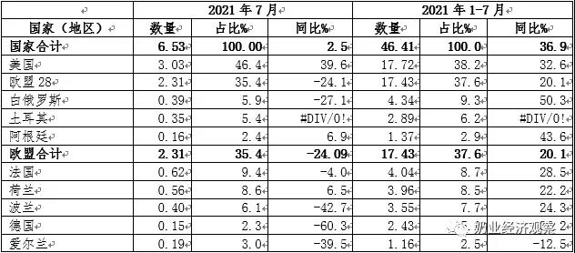 外貿(mào)數(shù)據(jù)沒有統(tǒng)計分析牛冷凍精子進口總數(shù),從額度看來,2021年1-7月進出口額達474七萬美金,同比增速59.4%,輸出國主要是:英國占91.4%;法國占2.7%;美國占1.7%;澳洲占1.6%;法國的占1.4%;西班牙占0.8%;丹麥占0.4%。