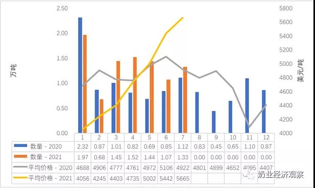 據(jù)海關(guān)統(tǒng)計分析,2021年1-7月我國共進口稀奶油15.92萬噸,同比增速48.3%,進出口額5.44億美金,同比增加57.7%,均價為3410美元/噸,同期相比增漲6.3%。
