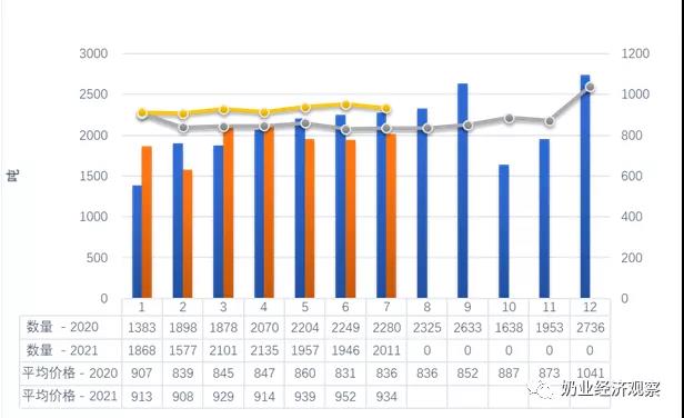 據(jù)海關(guān)統(tǒng)計分析,2021年1-7月我國共進口酸牛奶類1.42萬噸,同比減少26.4%,進出口額0.28億美金,同比減少14.4%,均價為1997美元/噸,同期相比增漲16.2%。