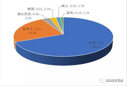在其中,從歐盟國家進口9.99萬噸級,占68.6%,同比減少27%,從澳大利亞進口3.4一萬噸,占23.4%,同比減少16%,從澳洲進口0.45萬噸,占3.1%,同比減少35.2%。