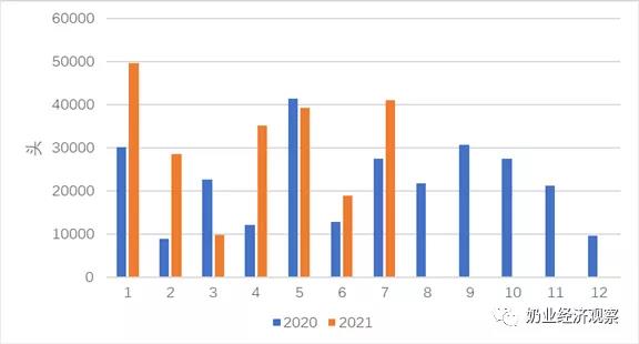 燕麥草的進口所有來自于澳洲,受澳大利亞燕麥草生產(chǎn)制造加工廠進出口許可證及其新春佳節(jié)補貨危害將要期滿危害,燕麥草貿(mào)易公司增加一季度燕麥草到港市場集中度。4月逐漸進口燕麥草斷崖式下降,6月每月出口量為2015年至今最少,7月小幅度回暖,預(yù)估2021年我國燕麥草進口將發(fā)生斷崖式下跌。