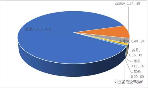 從美國品牌3.0三萬噸,占46.4%,同比增速39.6%,從歐盟國家進口2.3一萬噸,占35.4%,同比減少24.1%,從俄羅斯進口0.39萬噸級,占5.9%,同比減少27.1%。