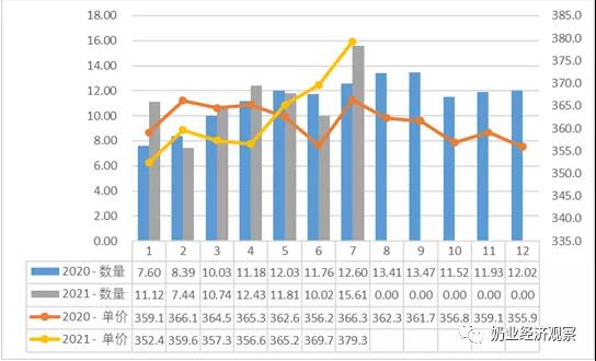 2021年7月在我國進口紫花苜蓿麥草15.6一萬噸,同期相比 23.9%;進口額度5920.24萬美金,同期相比 28.3%;均值到岸價379.3美元/噸,同比 2.6%,同期相比 3.5%。