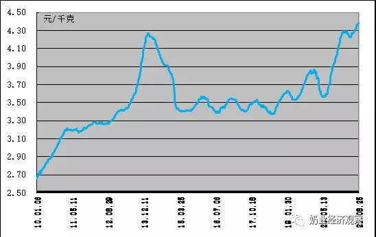據(jù)農(nóng)業(yè)農(nóng)村部數(shù)據(jù)監(jiān)測,8月生鮮食品乳價錢持續(xù)提升新紀錄,各周價錢均同比增漲,月度平均價4.37元/Kg,同比增漲1.2%,同期相比增漲17.0%,最后一周價錢4.38元/KG,比前一周增漲0.2%,同期相比增漲17.1%。苞米月度平均價2.95元/Kg,環(huán)比下降0.8%,持續(xù)2月降低,同期相比增漲21.4%;豆柏月度平均價3.79元/Kg,同比增漲1.2%,同期相比增漲15.6%。