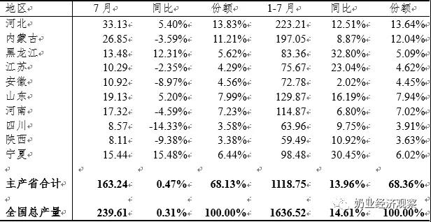 1-7月,液奶生產(chǎn)量前10位省區(qū)同期相比所有正提高,累計1118.75萬噸級,同比增加13.96%,占國內(nèi)總量的68.36%,河北省生產(chǎn)量223.21萬噸級,同比增加12.51%,占國內(nèi)總量的13.64%,居全國各地第一位。7月,10個主產(chǎn)區(qū)省區(qū)中,生產(chǎn)量同比減少的省區(qū)提升,僅有河北省、黑龍江省、山東省、甘肅生產(chǎn)量同比增加,10省區(qū)生產(chǎn)量累計163.24萬噸級,同比增加0.47%,占本月全國各地總量的68.13%,河北省生產(chǎn)量33.13萬噸級,同比增加5.40%,占本月總產(chǎn)值的13.83%。