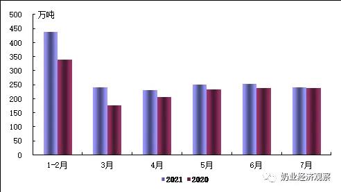 依據(jù)國家統(tǒng)計數(shù)據(jù)信息,2021年1-7月全國各地干奶制品生產(chǎn)量109.十萬噸,同比增加8.53%,在其中7月生產(chǎn)量13.8三萬噸,同比減少0.24%。