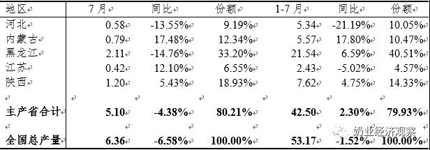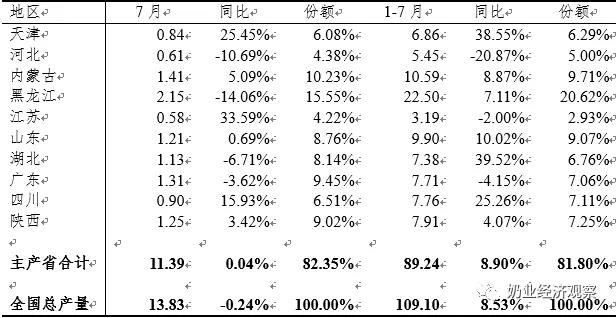 1-7月,干奶制品生產(chǎn)量前10位的省區(qū)中,河北省、江蘇省、廣東省生產(chǎn)量同比減少,別的省區(qū)生產(chǎn)量同比增加,10省區(qū)生產(chǎn)量累計89.24萬噸,同比增加8.90%,占國內(nèi)總量的81.80%,黑龍江省生產(chǎn)量最大,22.五十萬噸,同比增加7.11%,占國內(nèi)總產(chǎn)值的20.62%。7月,這10省區(qū)干奶制品生產(chǎn)量累計11.39萬噸級,同比增加0.04%,占本月全國各地總量的82.35%,黑龍江省生產(chǎn)量2.十五萬噸,同比減少14.06%,占本月全國各地總產(chǎn)值的15.55%。